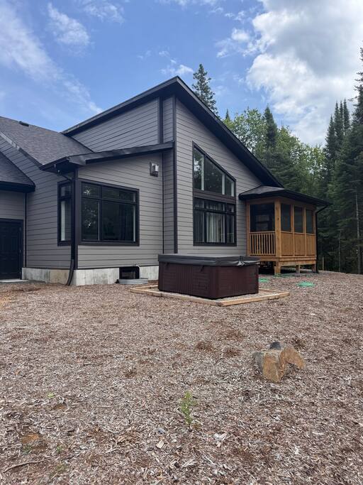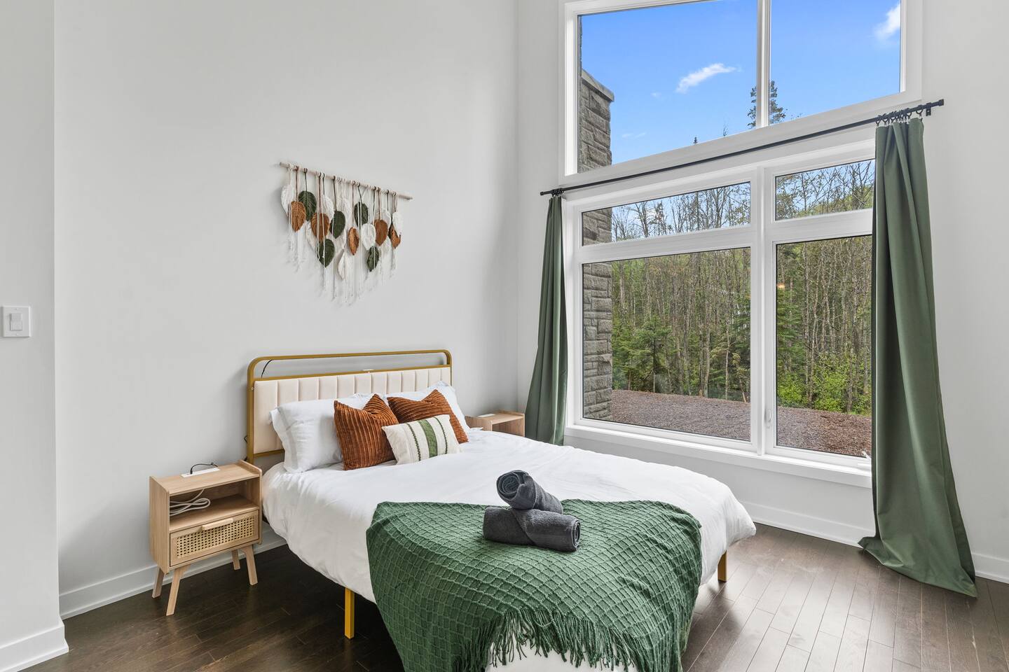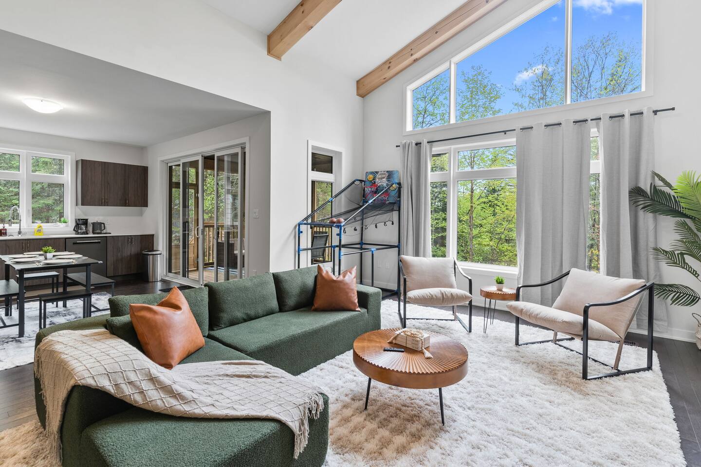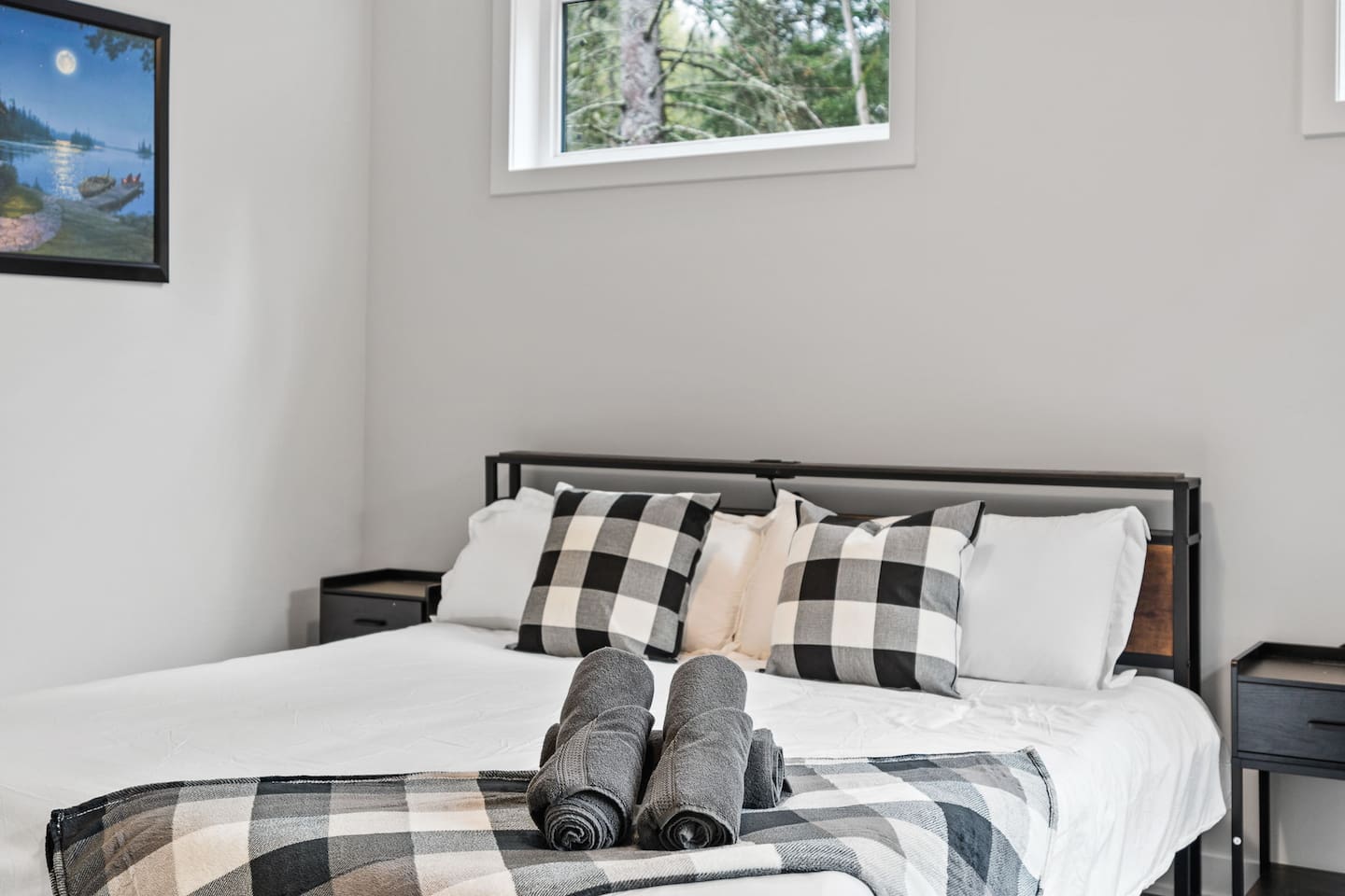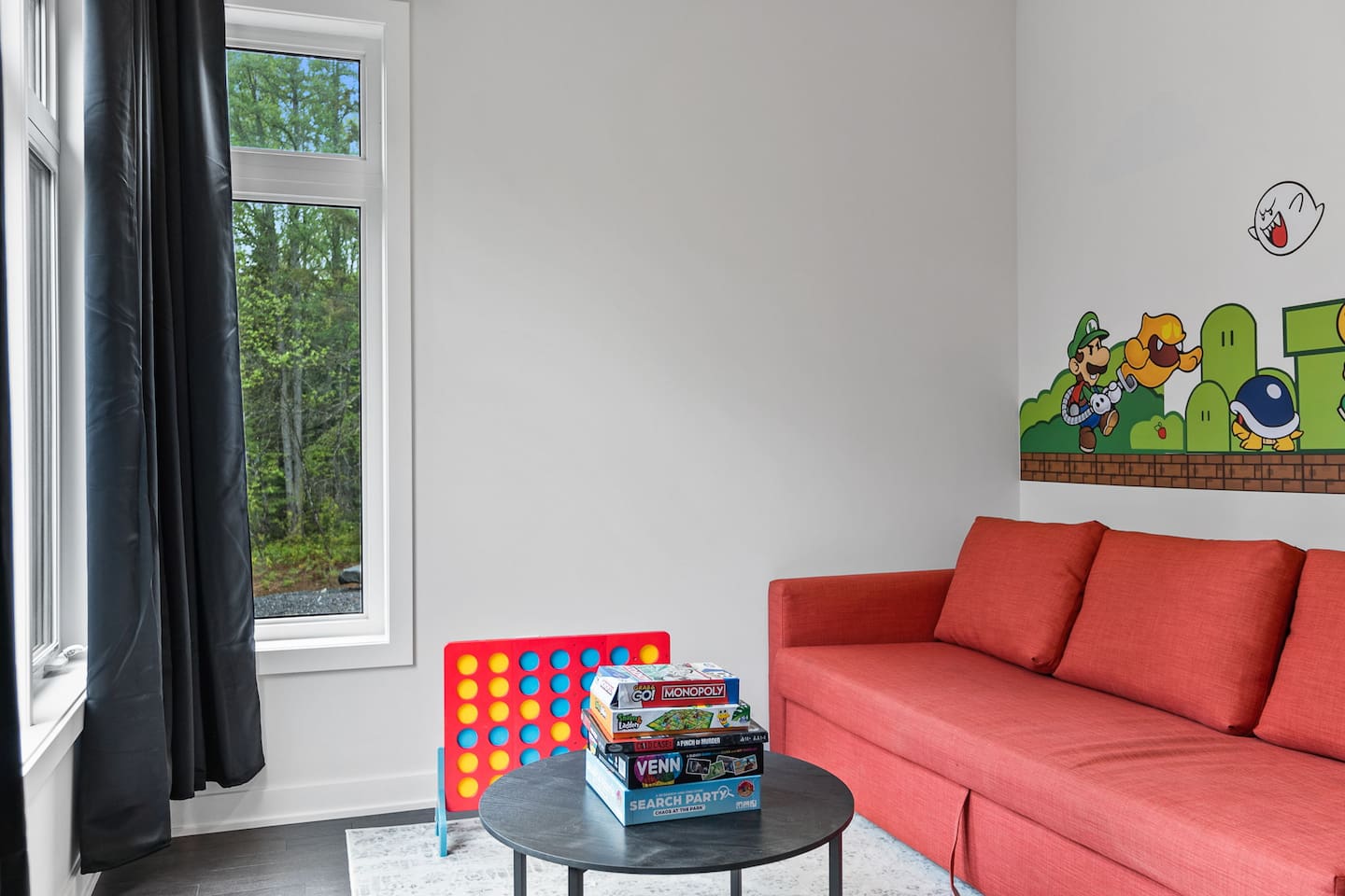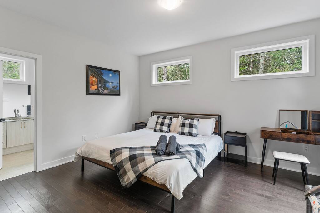 The backyard is your go-to space for reconnecting with nature and spending quality time with loved ones. ✔ Unwind in the 4-seater HOT TUB, perfect for relaxing after a day of adventure. ⭐️ LIVING ROOM ► Built in 2024, this open-concept cottage features soaring vaulted ceilings and floor-to-ceiling windows, flooding the space with natural light and views of the pines. ✔ Stylish boutique-style décor for a cozy, modern vibe ✔ Leather sofa with plush pillows and throws ✔ Oversized basket chair—great for couples ✔ 60” 4K Ultra HD Smart TV for movie nights ⭐️ KITCHEN & DINING ► The fully equipped kitchen comes with everything you need to whip up home-cooked meals or enjoy a quiet breakfast on the patio. ✔ All essential cooking appliances provided ✔ Dining table for family meals ✔ Patio seating for sunny breakfasts ✔ Classic table tennis for a dose of fun ⭐️ MASTER BEDROOM ► Wake up to sunlight streaming through tall windows overlooking the forest. Step out to your private patio or enjoy the hot tub just steps away. Sleeps 2. ✔ KING-size ENDY mattress with soft cotton linens and goose-down duvet ✔ Crib available for little ones ✔ Vanity station in the room ✔ Pillows include a mix of shredded microfiber and goose-down ⭐️ MASTER BATHROOM ► Spacious and spa-like, featuring: ✔ Free-standing tub ✔ Standing shower ✔ Makeup vanity ✔ Essentials and toiletries provided ⭐️ BEDROOM 2 ► Cozy and calming with a QUEEN-size bed, perfect for a restful night’s sleep. Sleeps 2. ✔ High-quality linens, soft sheets, and supportive pillows ⭐️ BATHROOM 2 ► Second full bathroom, fully stocked with fresh towels and all essentials—just bring yourself! ⭐️ GAME ROOM ► Step into a Mario-themed fun zone built for laughs, games, and good times. ✔ Foosball table and Connect 4 ✔ Pullout couch (sleeps 2) ✔ A collection of board games ✔ Cozy theater-style lighting and strip lights ⭐️ MUSKOKA ROOM ► A cozy retreat for relaxing year-round with views of nature all around. ✔ Spacious 6-seater sectional couch ✔ Electric fire pit for warmth and ambiance ✔ Magical fairy lights ✔ 3-burner BBQ for delicious meals ⭐️ THINGS TO DO ⭐️ Winter Activities: ✔ Skiing ✔ Snowboarding ✔ Snowshoeing ✔ Snowmobiling (Just 10 minutes from Hidden Valley Ski Resort!) ⭐️ Spring, Summer & Fall Activities: ✔ Biking ✔ Hiking ✔ Rock climbing ✔ Golf ✔ Horseback riding ✔ Local microbreweries Nearby Parks: ✔ Limberlost Forest & Wildlife Reserve ✔ Arrowhead Provincial Park ✔ Algonquin Provincial Park (15–20 minutes away) More Nearby Attractions: ✔ Deerhurst Resort (10 mins) ✔ Dorset Lookout Tower (10 mins) ✔ Downtown Huntsville (15 mins) Water Activities: ✔ Canoeing, kayaking, motorized water sports – all within 10 minutes Local Charm: ✔ Seasonal farmers markets, local events, and more just around the corner!
