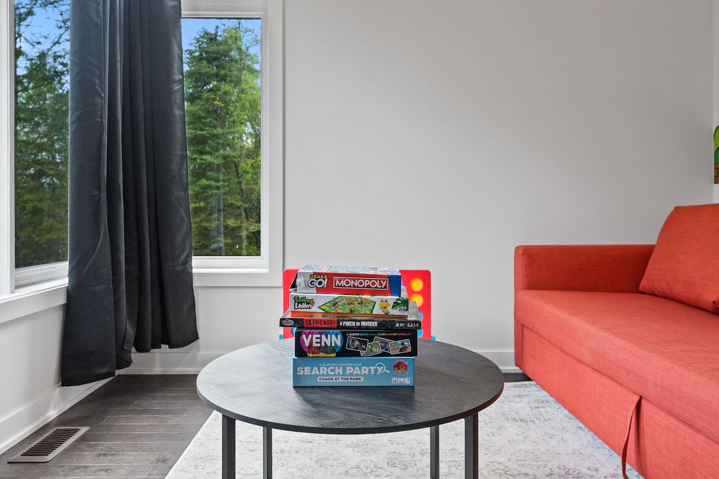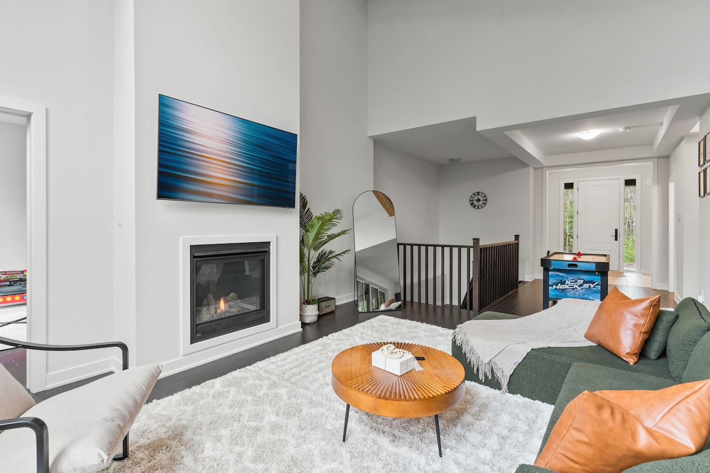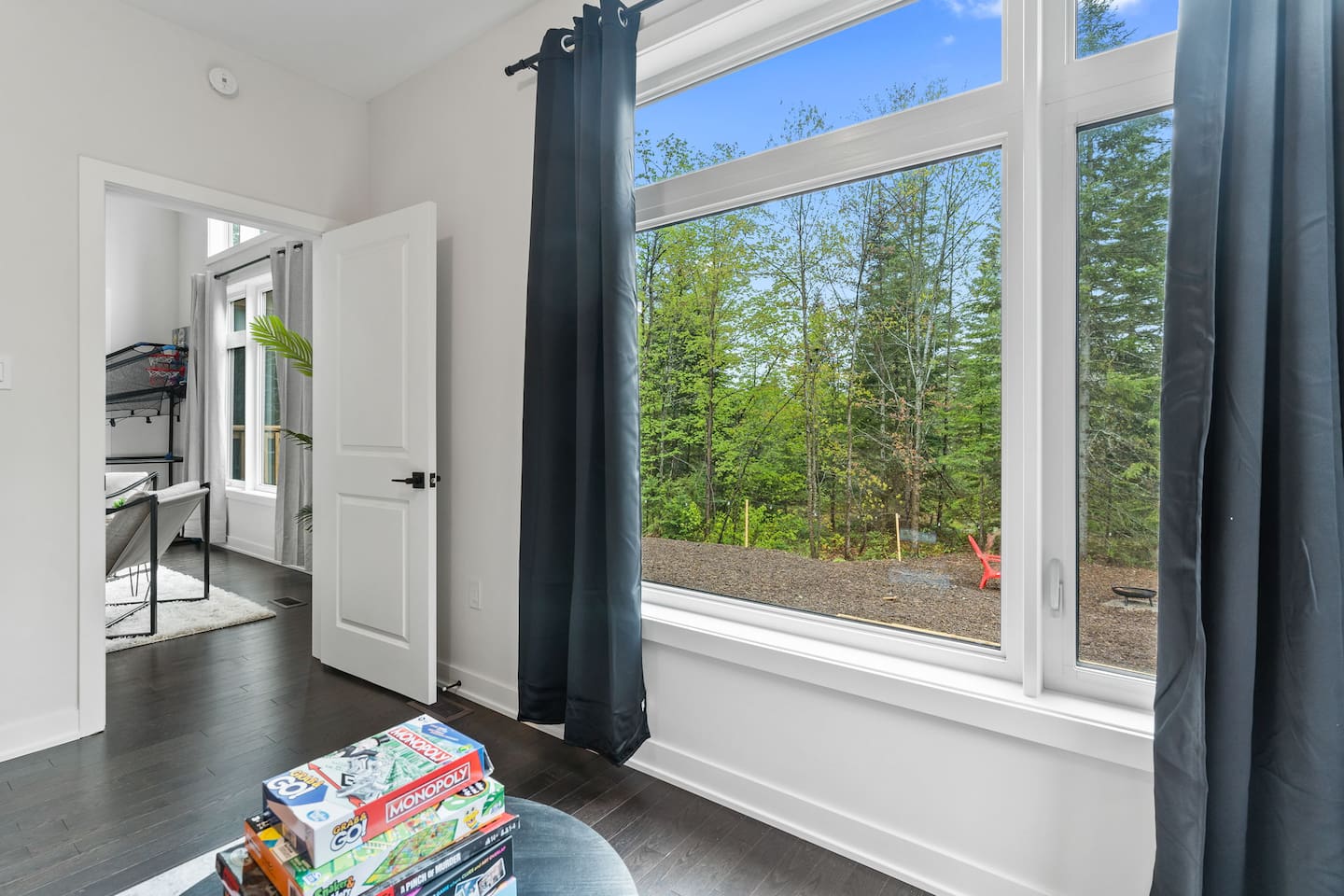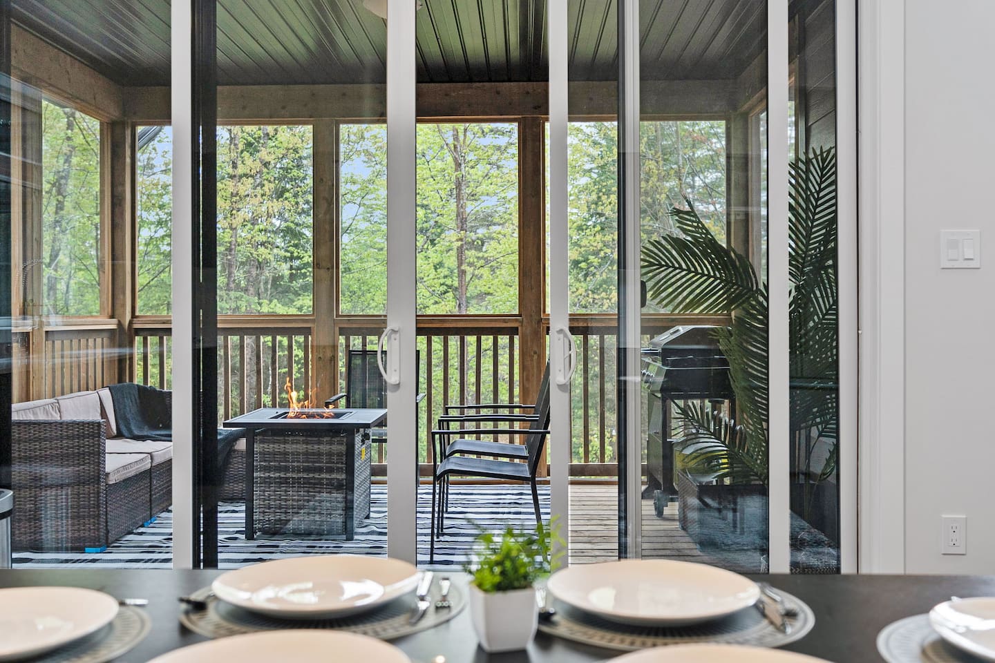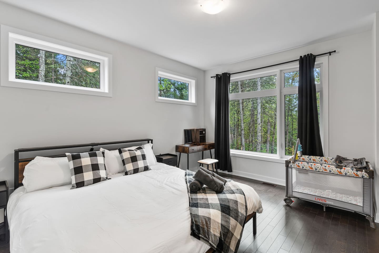 The backyard is your go-to space for reconnecting with nature and spending quality time with loved ones. ✔ Unwind in the 4-seater HOT TUB, perfect for relaxing after a day of adventure. ⭐️ LIVING ROOM ► Built in 2024, this open-concept cottage features soaring vaulted ceilings and floor-to-ceiling windows, flooding the space with natural light and views of the pines. ✔ Stylish boutique-style décor for a cozy, modern vibe ✔ Leather sofa with plush pillows and throws ✔ Oversized basket chair—great for couples ✔ 60” 4K Ultra HD Smart TV for movie nights ⭐️ KITCHEN & DINING ► The fully equipped kitchen comes with everything you need to whip up home-cooked meals or enjoy a quiet breakfast on the patio. ✔ All essential cooking appliances provided ✔ Dining table for family meals ✔ Patio seating for sunny breakfasts ✔ Classic table tennis for a dose of fun ⭐️ MASTER BEDROOM ► Wake up to sunlight streaming through tall windows overlooking the forest. Step out to your private patio or enjoy the hot tub just steps away. Sleeps 2. ✔ KING-size ENDY mattress with soft cotton linens and goose-down duvet ✔ Crib available for little ones ✔ Vanity station in the room ✔ Pillows include a mix of shredded microfiber and goose-down ⭐️ MASTER BATHROOM ► Spacious and spa-like, featuring: ✔ Free-standing tub ✔ Standing shower ✔ Makeup vanity ✔ Essentials and toiletries provided ⭐️ BEDROOM 2 ► Cozy and calming with a QUEEN-size bed, perfect for a restful night’s sleep. Sleeps 2. ✔ High-quality linens, soft sheets, and supportive pillows ⭐️ BATHROOM 2 ► Second full bathroom, fully stocked with fresh towels and all essentials—just bring yourself! ⭐️ GAME ROOM ► Step into a Mario-themed fun zone built for laughs, games, and good times. ✔ Foosball table and Connect 4 ✔ Pullout couch (sleeps 2) ✔ A collection of board games ✔ Cozy theater-style lighting and strip lights ⭐️ MUSKOKA ROOM ► A cozy retreat for relaxing year-round with views of nature all around. ✔ Spacious 6-seater sectional couch ✔ Electric fire pit for warmth and ambiance ✔ Magical fairy lights ✔ 3-burner BBQ for delicious meals ⭐️ THINGS TO DO ⭐️ Winter Activities: ✔ Skiing ✔ Snowboarding ✔ Snowshoeing ✔ Snowmobiling (Just 10 minutes from Hidden Valley Ski Resort!) ⭐️ Spring, Summer & Fall Activities: ✔ Biking ✔ Hiking ✔ Rock climbing ✔ Golf ✔ Horseback riding ✔ Local microbreweries Nearby Parks: ✔ Limberlost Forest & Wildlife Reserve ✔ Arrowhead Provincial Park ✔ Algonquin Provincial Park (15–20 minutes away) More Nearby Attractions: ✔ Deerhurst Resort (10 mins) ✔ Dorset Lookout Tower (10 mins) ✔ Downtown Huntsville (15 mins) Water Activities: ✔ Canoeing, kayaking, motorized water sports – all within 10 minutes Local Charm: ✔ Seasonal farmers markets, local events, and more just around the corner!